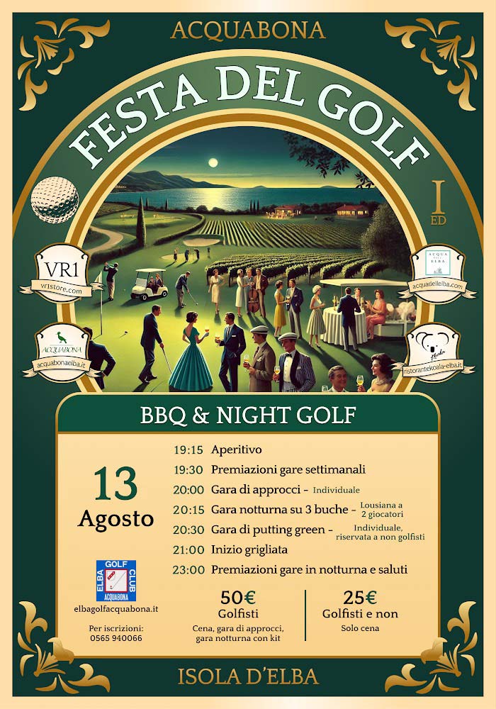 Der Abend beinhaltet einen Begrüßungsaperitif, ein gegrilltes Fleisch und unterhaltsame Abendaktivitäten für alle: Golfer, Sportler, Neugierige oder Menschen jeden Alters, die der Welt des Golfsports näher kommen möchten: einem Sport, der dem Wohlbefinden und dem Kontakt mit der Natur gewidmet ist . Der neue Vorstand – bestehend aus dem neuen Präsidenten Pietro Vallardi und dem Vizepräsidenten Federico Ballati sowie ihren Partnern – freut sich, alle Elbaner, Touristen und Freunde zu einem angenehmen gemeinsamen Abend einzuladen.