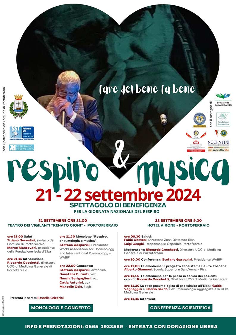Wissenschafts- und Musiktreffen mit Gasparini auf Elba, ein Musik- und Gesundheitsprogramm für ein unverzichtbares Ereignis in Portoferraio, Samstag, 21. September, um 21.00 Uhr im Teatro dei Vigilanti „Renato Cioni“ und am darauffolgenden Tag, Sonntag, 22. September, um 9.30 Uhr, im Hotel Airone, mit einer medizinischen Koryphäe: Prof. Stefano Gasparini, international bekannter interventioneller Pneumologe, der Protagonist des Insel Elba eines Wohltätigkeitsabends mit einem Monolog zum Thema „Atmung, Pneumologie und Musik“ und später am selben Abend als leidenschaftlicher Musiker der Mundharmonika, die als geeignetes Instrument für die Behandlung gilt von Atemwegserkrankungen. Gasparini ist Präsident von WABIP – Weltverband für Bronchologie und interventionelle Pulmonologie