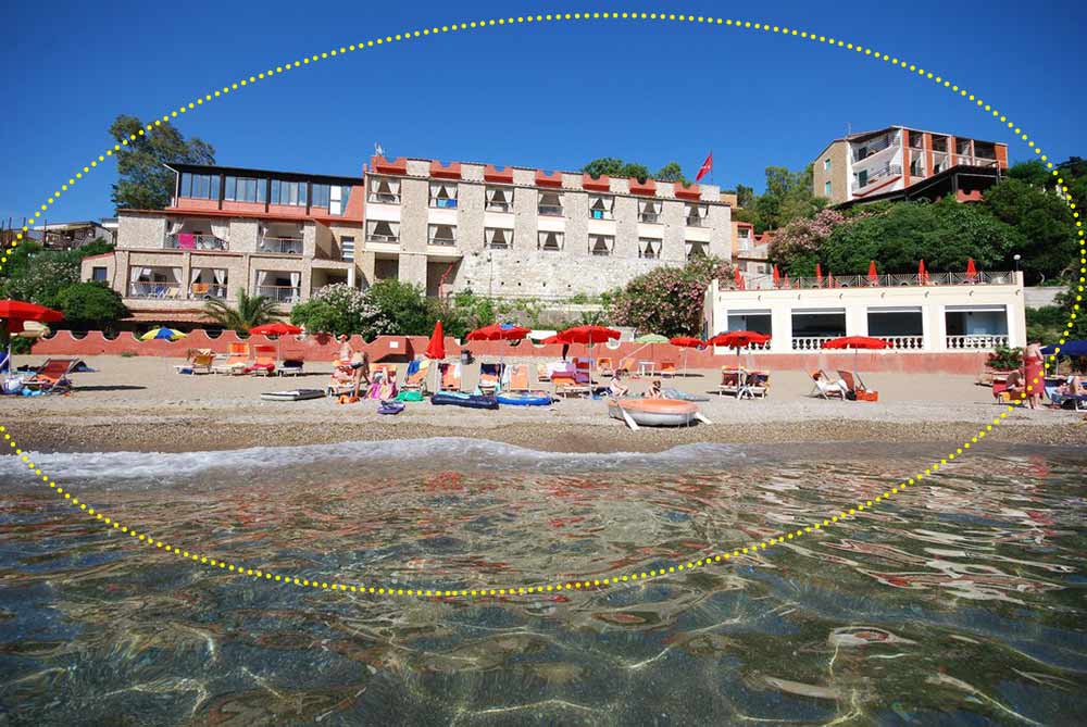 Blick vom Meer auf das Hotel La Scogliera und den Strand von Morcone