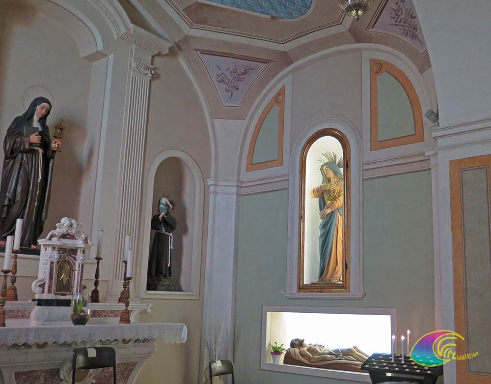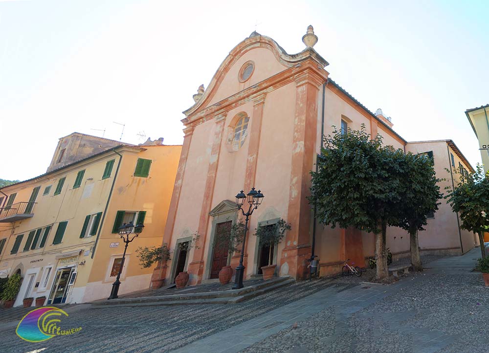 Die Kirche Heilig Chiara Marciana Marina stammt aus dem Jahr 1776 und trägt den gleichen Titel wie eine frühere Kirche aus dem 17. Jahrhundert, die sich an der heutigen Uferpromenade der Stadt befand. Es hat ein einziges Schiff, mit der Fassade geschmückt mit vier Säulen und einem Gesims, auf dem ein Frontispiz ruht, die Marmortaufe rechts vom Eingang, die Weihwasserabläufe aus schwarzem Marmor, der Kastanienchor findet die Orgel aus dem Jahr 1829 The Altäre sind der Madonna del Rosario, den Seelen im Fegefeuer und dem Allerheiligsten Kruzifix gewidmet, wo die „Kreuzigung“ dominiert. Der Hochaltar ist aus Marmor mit einem mit Putten verzierten Ziborium. An den Seiten enthalten die Vitrinen Votivgaben und sakrale Ausstattung und rechts eine Nische mit der Stuckstatue der „Madonna Addolorata“ mit Blick auf den toten Christus.